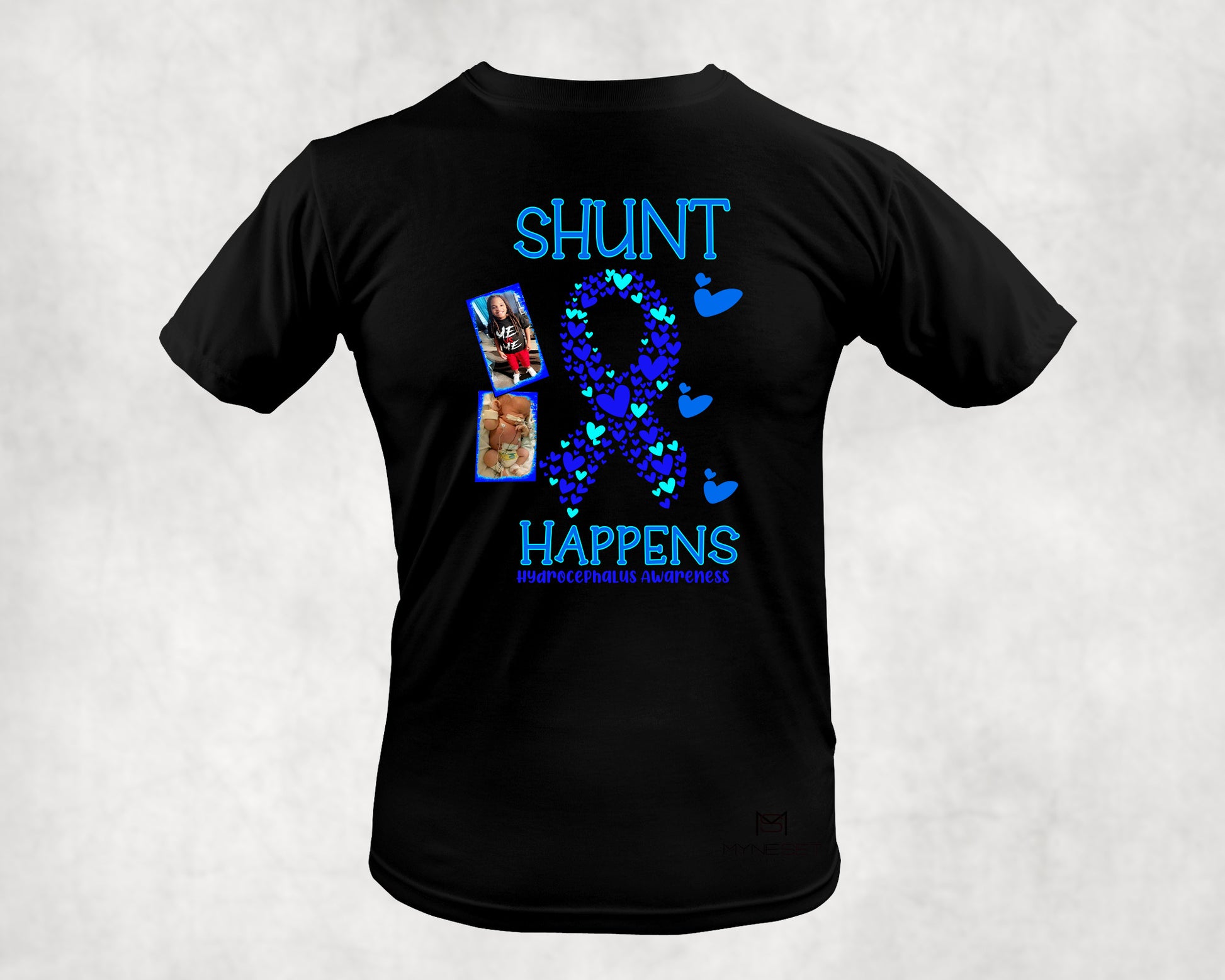 Show your support for Hydrocephalus Awareness with our “Shunt Happens” T-shirt. Featuring a heart-filled blue awareness ribbon and personalized photo accents, this vibrant design spreads love, strength, and awareness for the cause — available in both black and white tees.